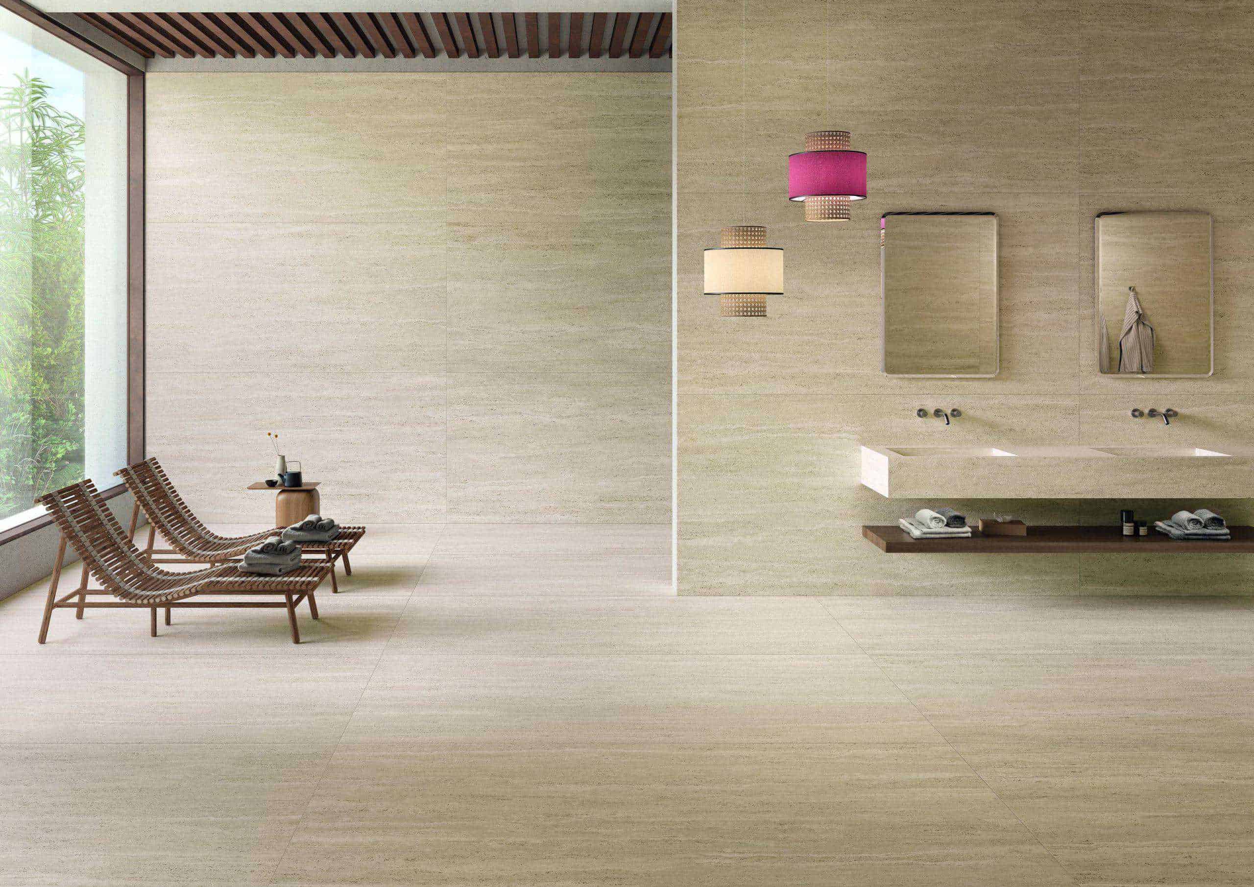 Baie cu gresie portelanata tip travertin Omnia. Gresie porțelanată aspect travertin 60×120 cm. Toate modelele din colecția de gresie Omnia.
