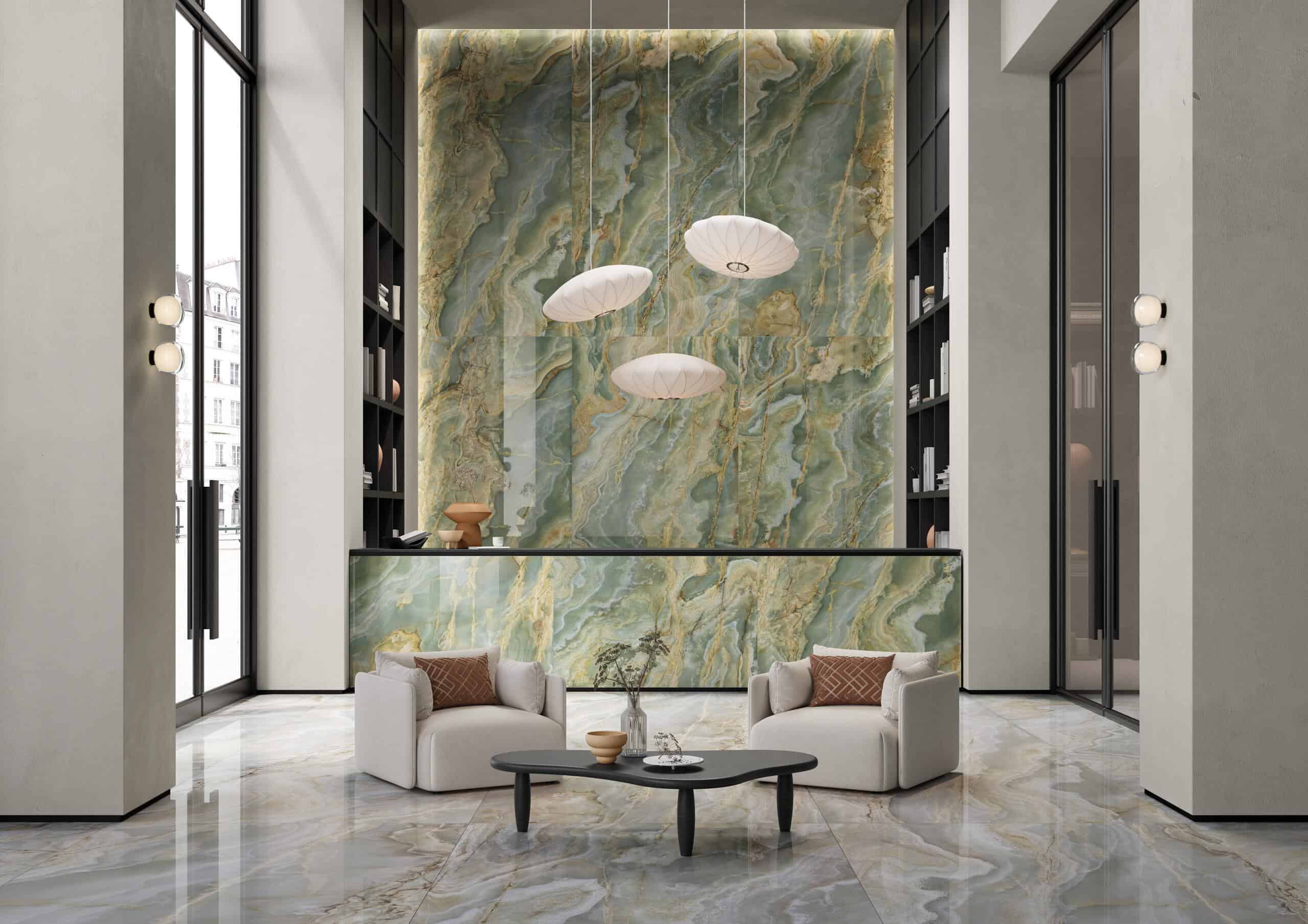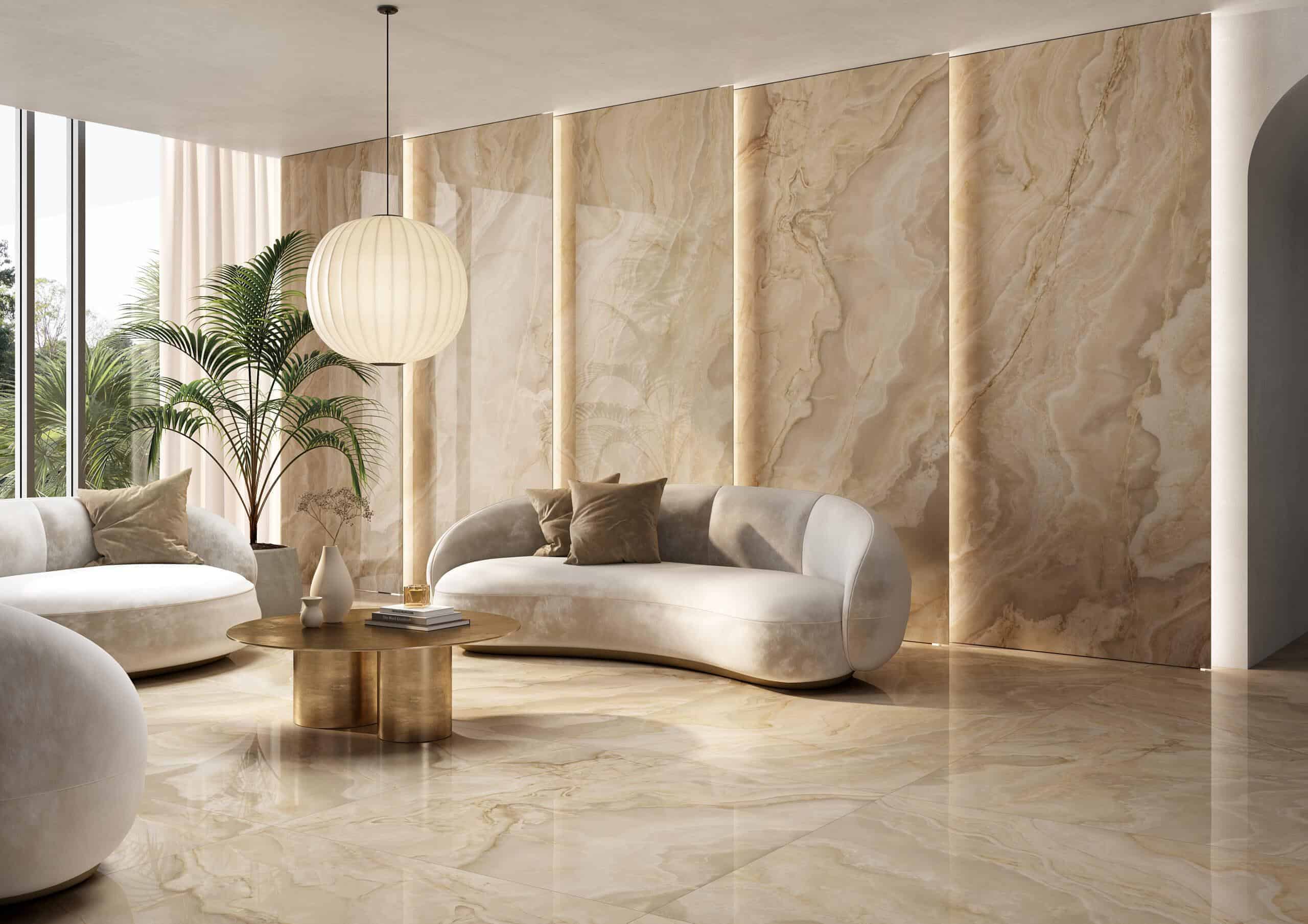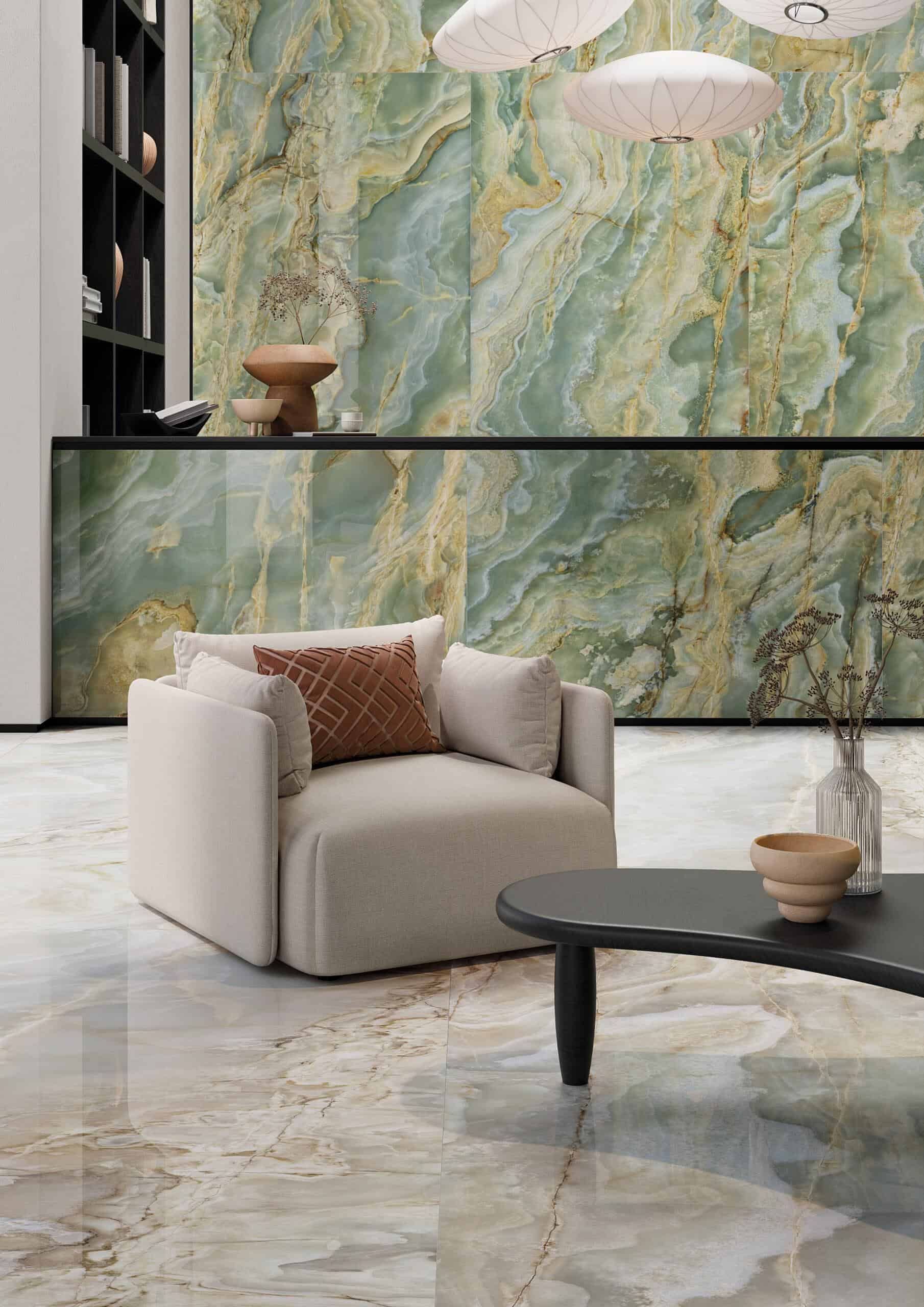 Gresie Onice Iride – placi de gresie si lastre ceramice portelanate, rectificate, suprafata lucioasa, modele ce reinterpreteaza realist si detaliat onixul natural. Colectie de gresie portelanata tip onix – Ava Ceramiche.