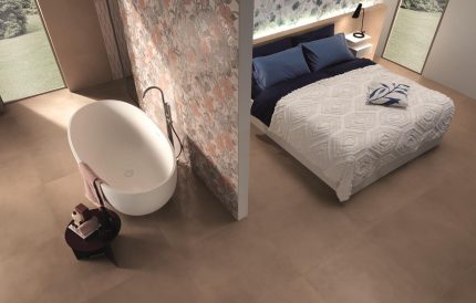 Baie cu Faianta Roma Calacatta, plăci de faianță simple și model 3D, dimenisiune 30,5×91,5 cm, plăci de faianță rectificate. Pardoseala din gresie porțelanată din colecția Nuances.
