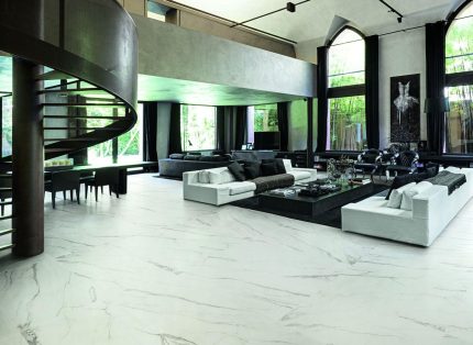 Gresie Portelanata tip Marmura Statuario Roma, plăci de gresie dimensiune 80×80 cm, suprafață mata. Perete living cu plăci de faianță din aceeași colecție. Descoperă toate modelele de gresie porțelanată din colecția Roma.