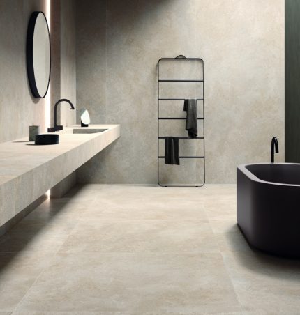 Baie cu lastre ceramice Onice Iride. Gresie porțelanată cu dimensiunea 120x278cm, gresie lucioasă, amenajare baie modernă, aspect lux. Descoperă toate elementele colecției Onice Iride.