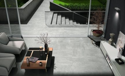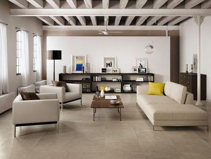 Gresie Portelanata tip Piatra Percorsi Quartz. Living cu gresie porțelanată tip piatră 60×60 cm. Vezi toate modelele de gresie din colecția Percorsi Quartz.