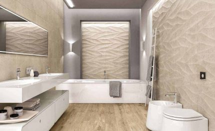 Baie Moderna cu Gresie tip Parchet si Faianta 3D Bej
